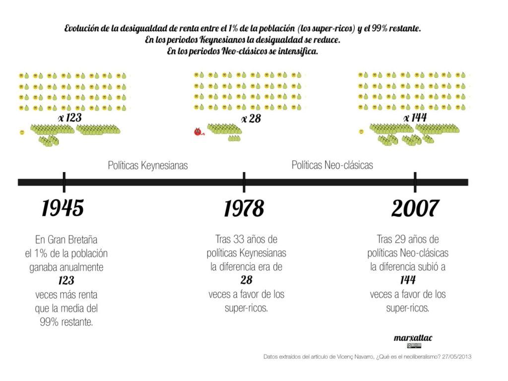En 1945 los súper ricos de Gran Bretaña recibían 123 veces más renta que el promedio de los ciudadanos. En veinte años de políticas keynesianas , en 1965, la diferencia de renta se había reducido a la mitad, es decir, era de 62 veces. En 1978, trece años más tarde, había alcanzado el menor diferencial quedando en 28 veces.